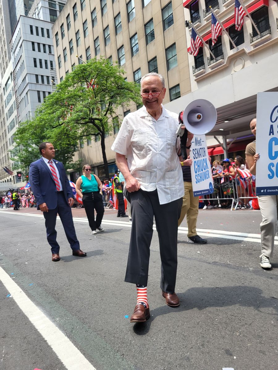 ¡¿Dónde están los boricuaaas?!”, grita por un altavoz Schumer, vestido con una guayabera blanca al tiempo que muestra sus calcetas con la bandera de las barras y la estrella, del país isleño.